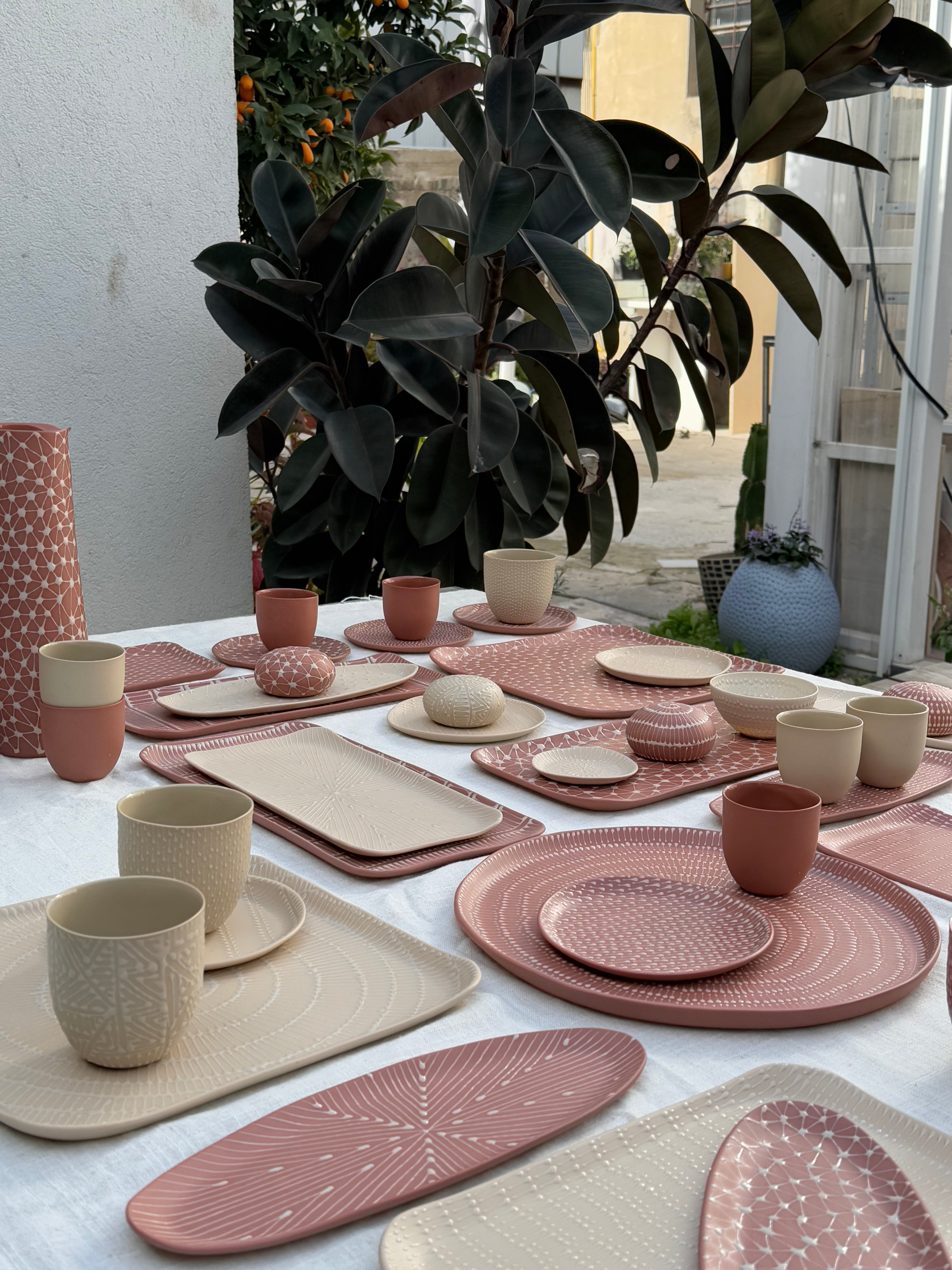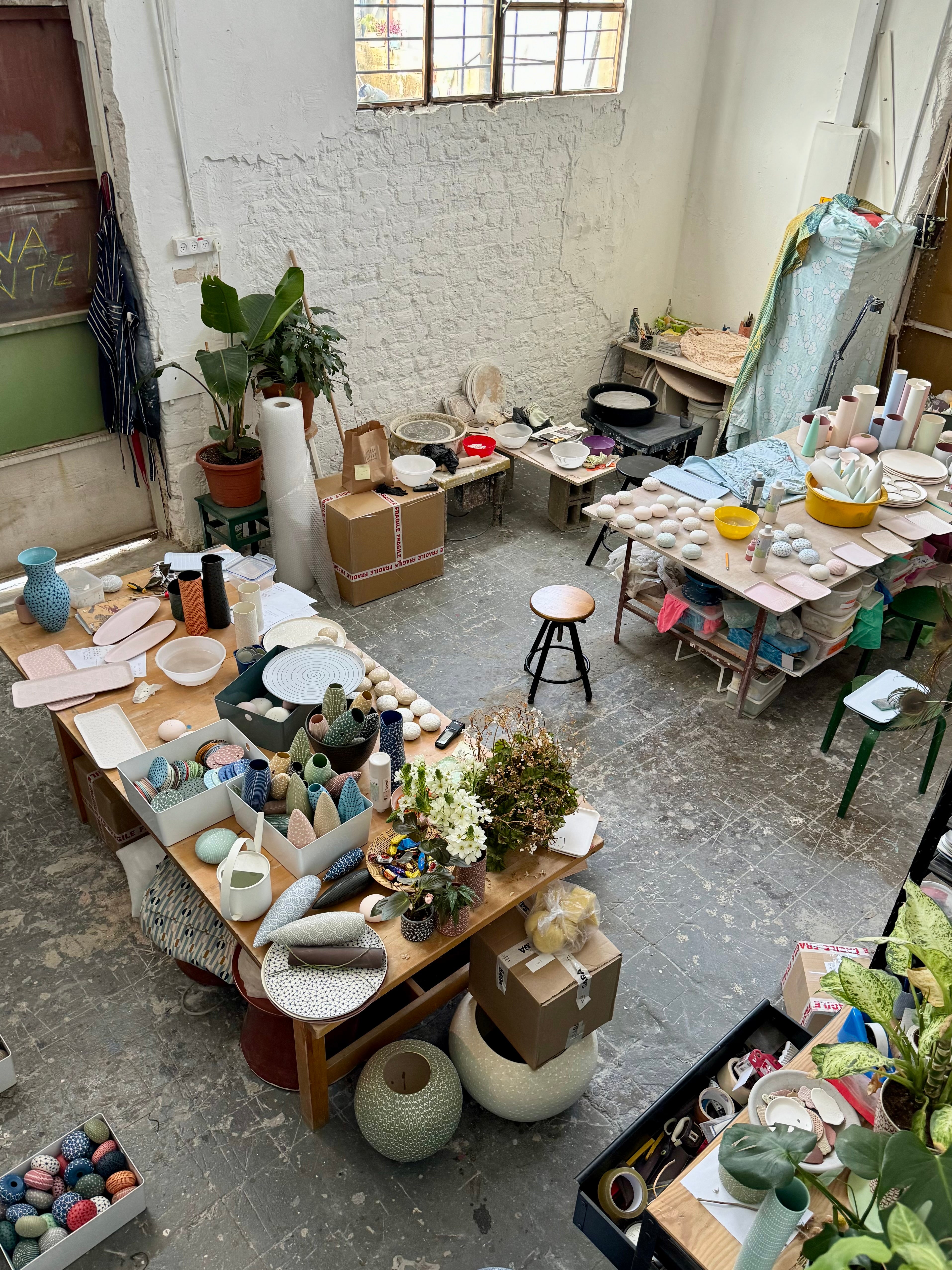 My studio is located in southern Tel Aviv, beyond the gate on 20 Bar Yochai street. I've created a tranquil and pleasant workspace surrounded by greenery and flowers that cuts you off from the pace and intensity of the city, and enables you to glide into a world of creativity and creation.